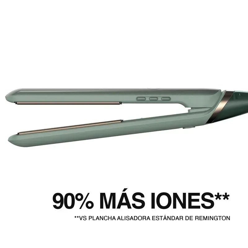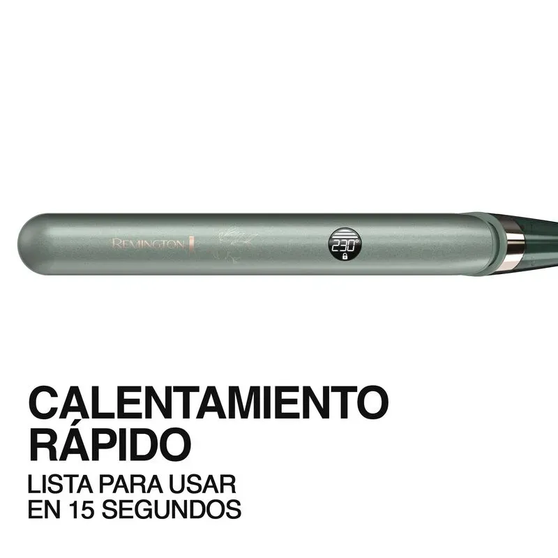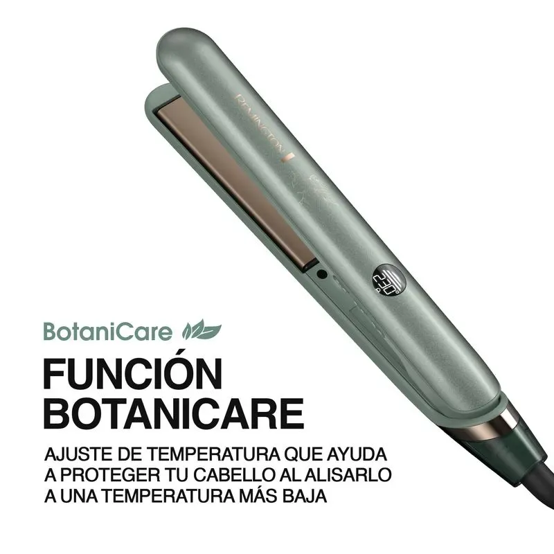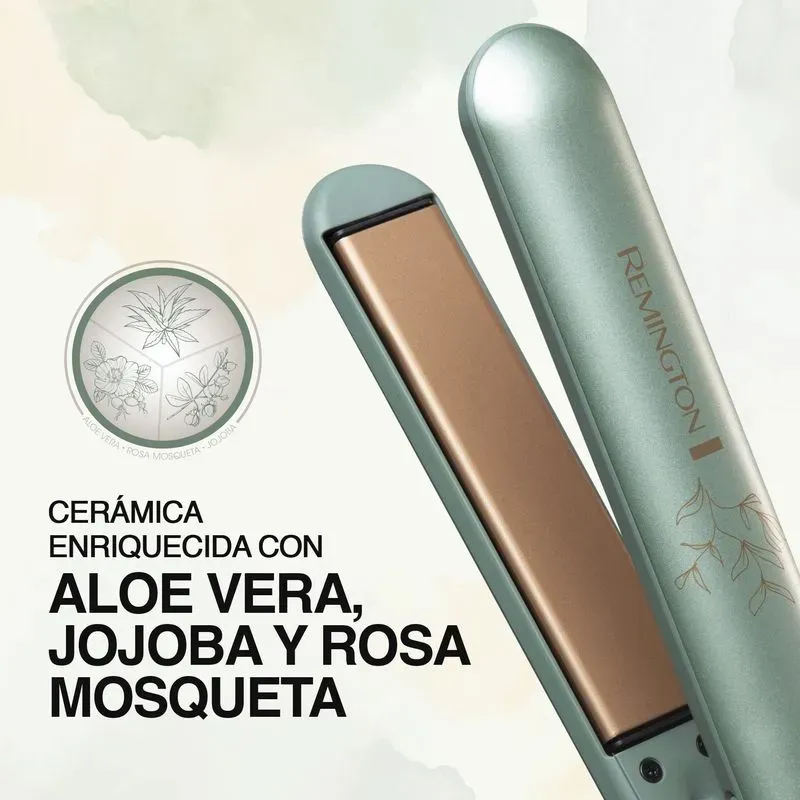 | Características técnicas | Plancha de cabello Remington Cerámica aloe vera, jojoba y rosa mosqueta control de frizz, S32A-110F. • Temperatura máxima de salón: 230 °C / 450 °F • Placa flotante de 110 mm • Control de temperatura digital con 10 niveles de temperatura • Función Botanicare. Ajuste de temperatura que ayuda a proteger tu cabello al alisarlo a una temperatura más baja. • Generador de iones • Calentamiento rápido de 15 segundos • Apagado automático • Cable giratorio de 2.7 m • Cierre de seguridad |