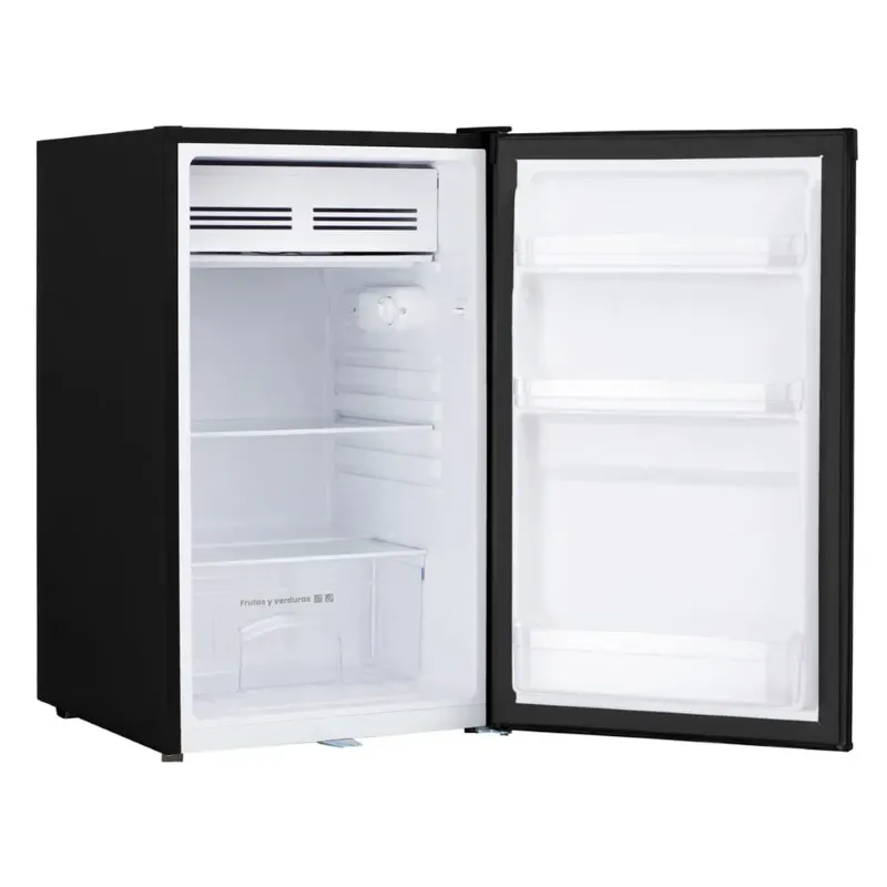 | Características técnicas | Minibar de 122 litros de capacidad con sistema de refrigeración de enfriamiento directo para conservación eficiente de bebidas y alimentos, diseño compacto ideal para habitaciones, oficinas o espacios pequeños, control de temperatura mecánico para ajuste sencillo del frío, iluminación interna LED para mejor visibilidad, parrillas ajustables para organizar botellas y recipientes, compartimientos en la puerta para latas y botellas, bandeja para frutas o snacks, funcionamiento silencioso y bajo consumo energético, refrigerante ecológico R600a, acabado negro moderno y puerta reversible para mayor flexibilidad de instalación. |