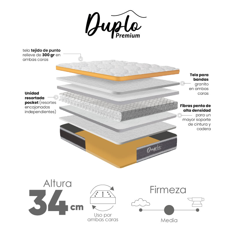 Características técnicas | Sistema Doble Pillow, Tela En Tejido De Punto De 300 Gr, Marco Perimetral Con Fibras De Celdas Abiertas Densidad 26 Para Mayor Soporte, Unidad Resortada Tipo Pocket, Tecnologia Penta Para Una Alta Sensaciòn De Confort Y Descanso Reparador, Nivel De Firmeza Media, Alto 34 Cm,Peso 35 Kilos, Uso Por Ambas Caras, Espuma Penta En Densidad 26. |