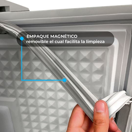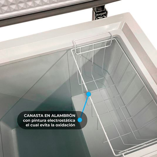 Congelador horizontal con chapa de seguridad, 2 patas niveladoras y 2 rodachines para facilitar su desplazamiento, gabinete interno y externo en lámina galvanizada prepintada, condensador interno que facilita la limpieza, sistema dual de temperaturas ( refrigerador y congelador), empaque de compresión removible para facilitar su limpieza, bajo nivel de ruido, iluminación tipo led y canastilla de gran resistencia.
