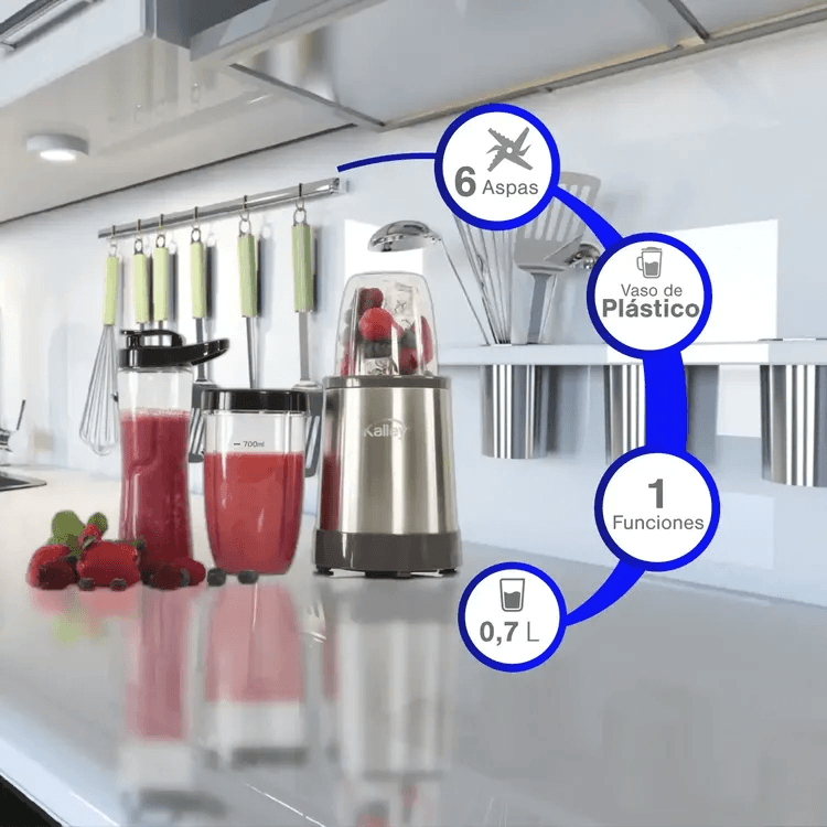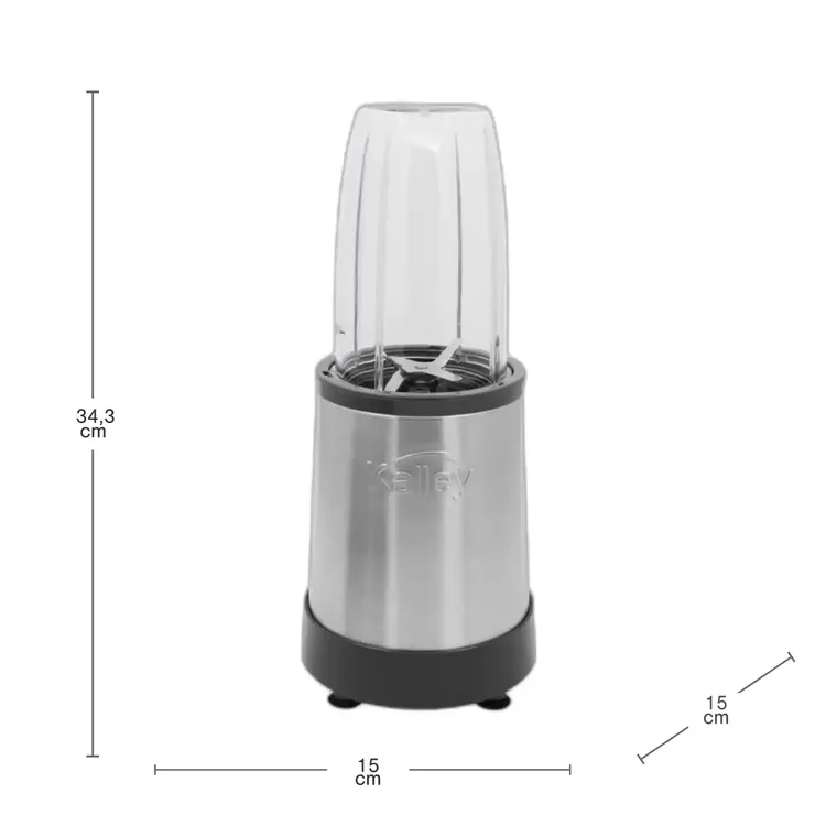 | Características técnicas | Licuadora Personal high mix kalley k-mvl700, incluye: 2 vasos de plástico, 2 cuchillas de acero inoxidable y 1 termo, cuerpo en acero inoxidable , 2 microswitches de seguridad, 2 microswitches de seguridad. garantia 2 años |